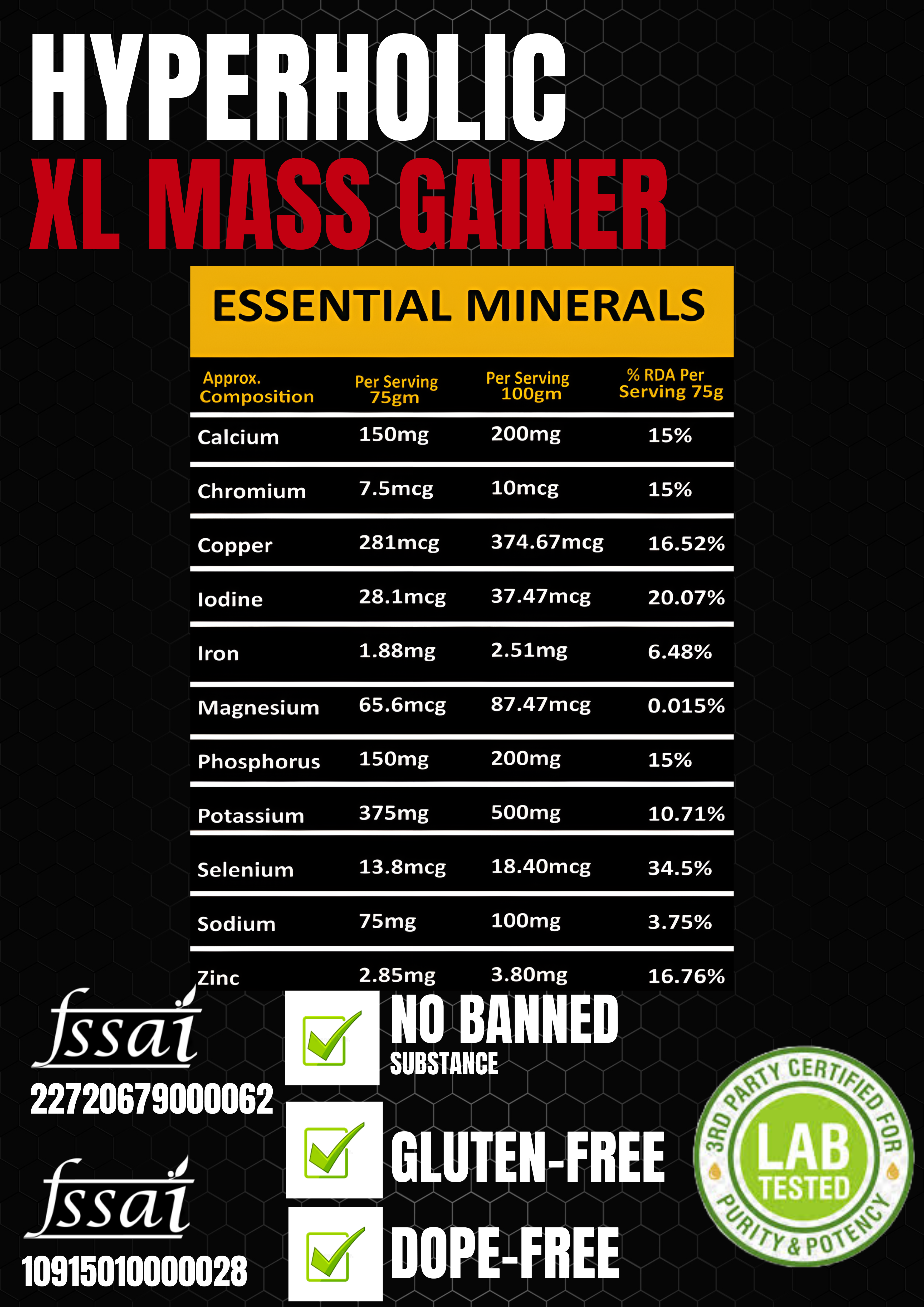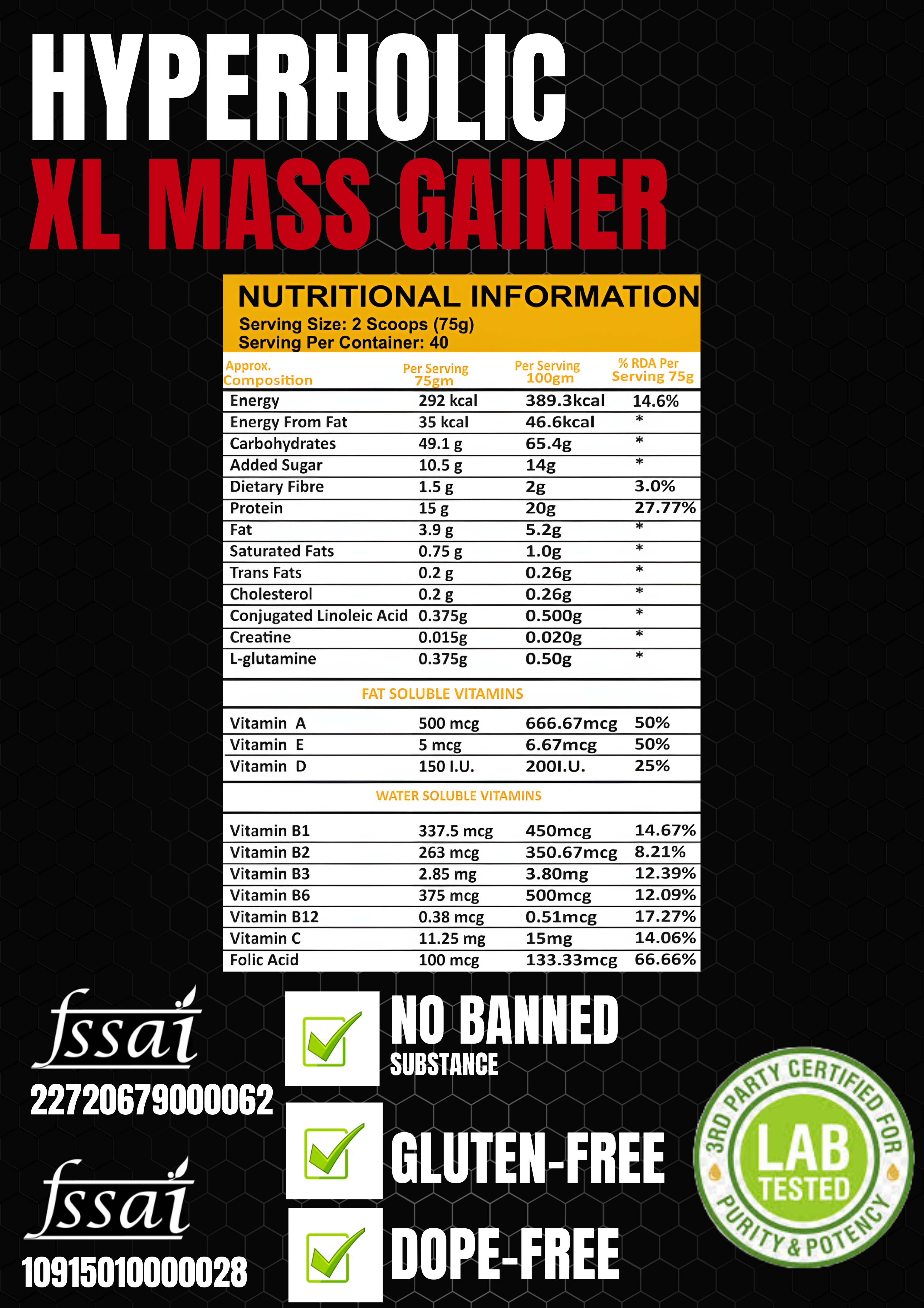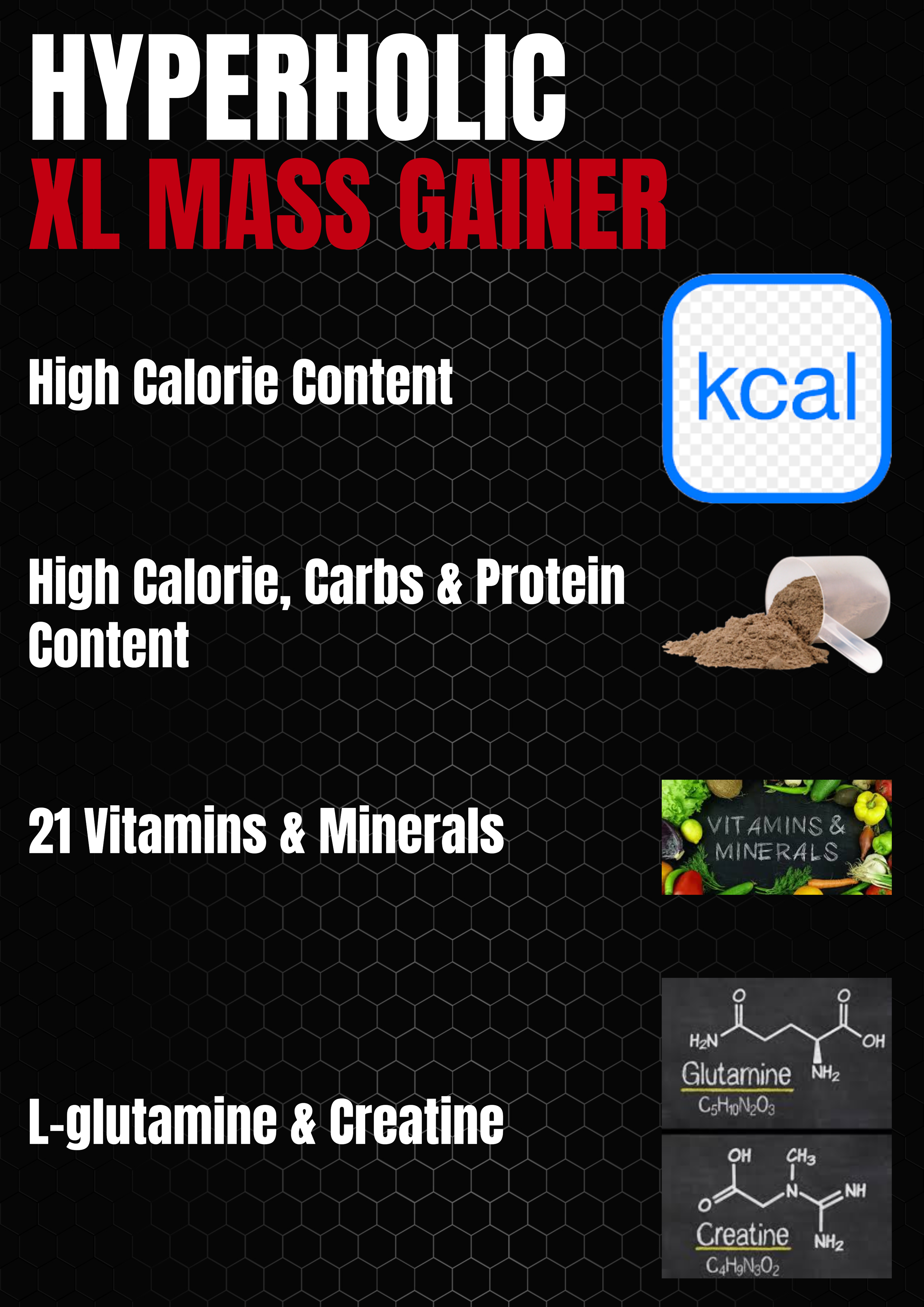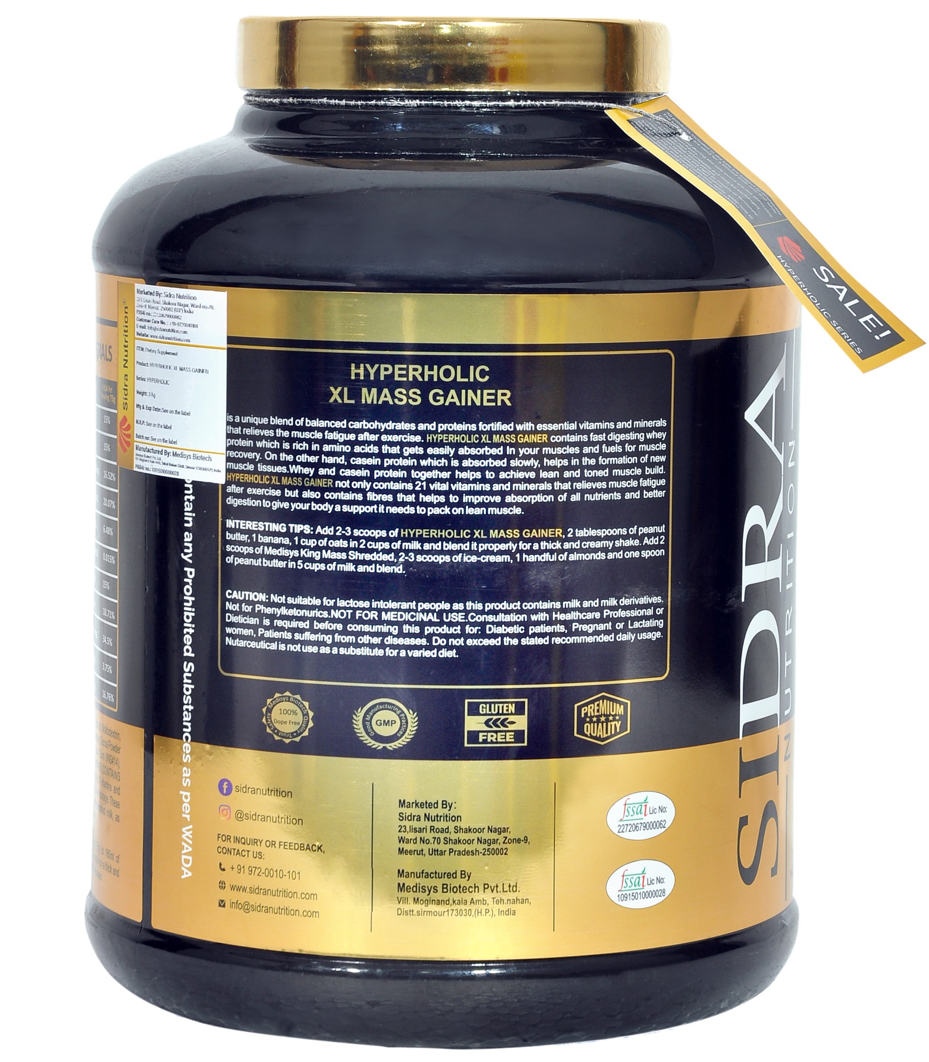 HYPERHOLIC XL MASS GAINER: Fuel Your Growth with Delicious Chocolate Butter Cookies Are you struggling to pack on muscle and gain weight? HYPERHOLIC XL MASS GAINER is your solution! This powerful 3 kg gaining formula is designed to help you maximize your gains with a 3:1 Carb to Protein ratio and a powerful blend of L-Glutamine and Creatine. Here’s what makes HYPERHOLIC XL stand out: Massive Muscle Support: The 3:1 Carb to Protein ratio provides the perfect balance of energy and building blocks for optimal muscle growth. Enhanced Recovery: L-Glutamine and Creatine work synergistically to aid in muscle recovery and promote faster growth. Complete Nutritional Profile: 24 essential vitamins and minerals ensure your body receives the nutrients it needs to thrive. Delicious Chocolate Butter Cookies Flavor: Enjoy a tasty and satisfying treat that makes reaching your goals easier than ever. High-Quality Ingredients: Made with premium ingredients for maximum effectiveness and absorption. HYPERHOLIC XL MASS GAINER is perfect for: Hardgainers: Struggling to gain weight? This formula provides the calories and nutrients you need to break through plateaus. Athletes: Maximize your performance and recovery with the essential nutrients and building blocks for muscle growth. Anyone looking to increase muscle mass: Whether you’re a beginner or seasoned lifter, HYPERHOLIC XL can help you achieve your fitness goals.